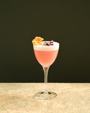 Dry shake first, add ice and shake again. Serve straight up and garnish with rose petals and an edible flower.