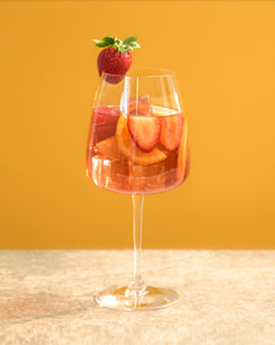 Built-in the glass, garnish with lemon, orange and strawberry slices.